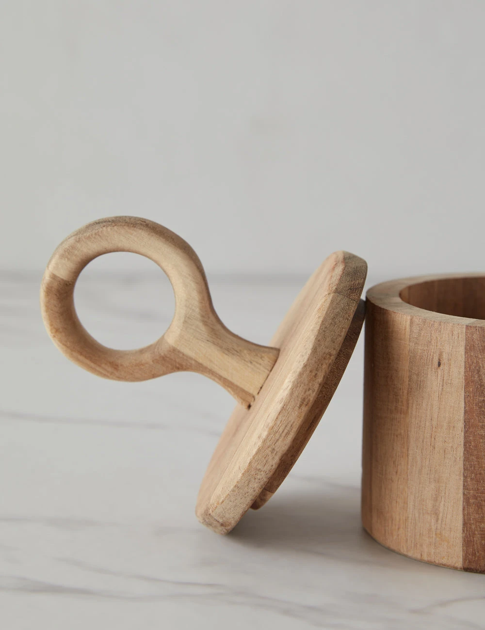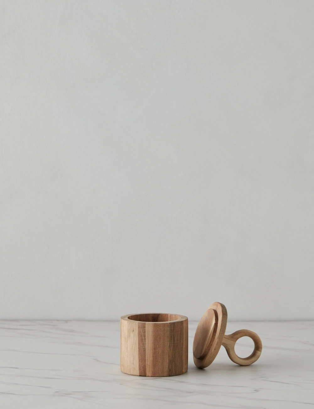 From herbal teas to favorite spices, this small wood container offers stylish covered storage for everyday essentials. The soft, rounded lines and beautiful acacia grain will bring effortless warmth to any counter or tabletop. You can even style this versatile piece as a handy catchall on your vanity or desk.