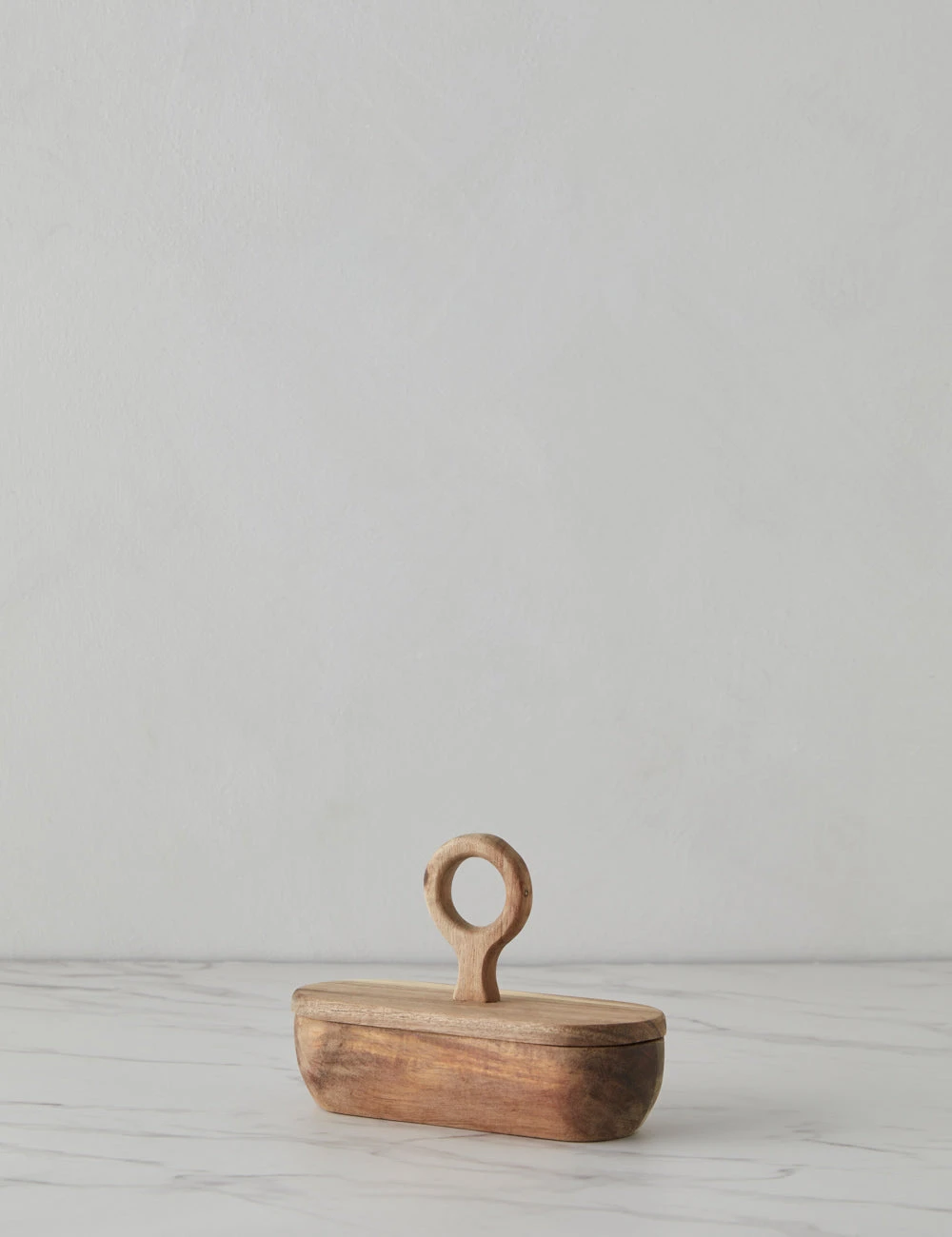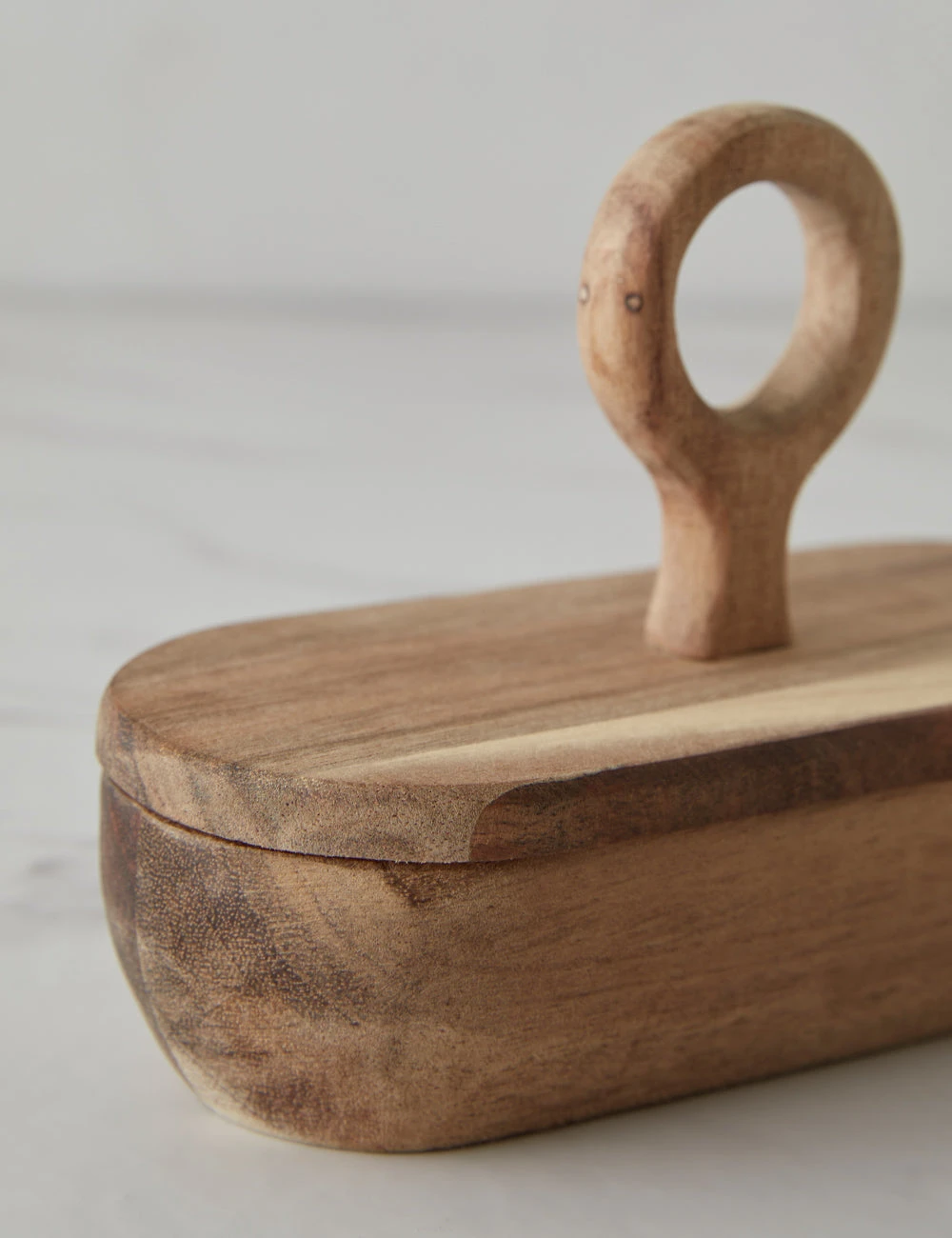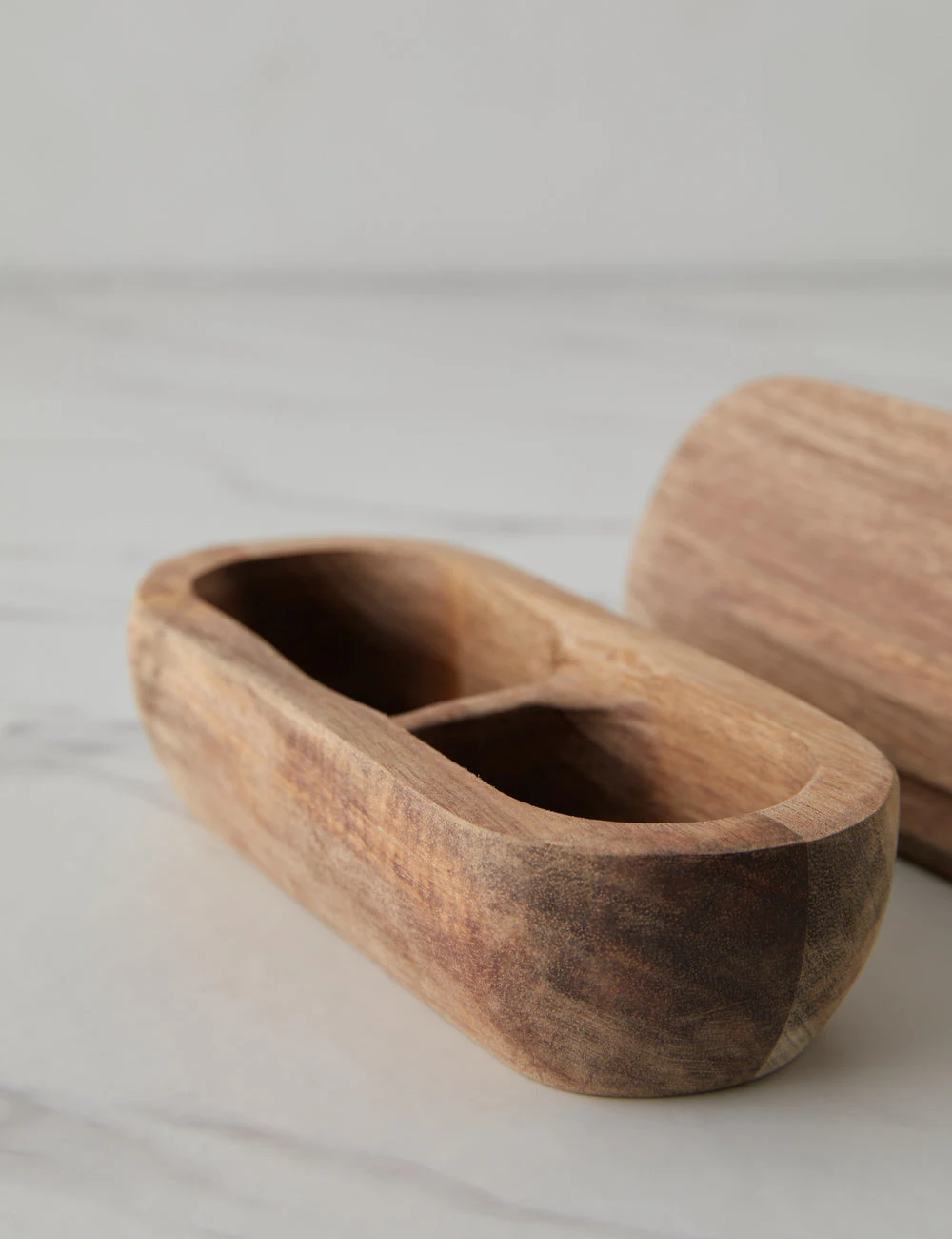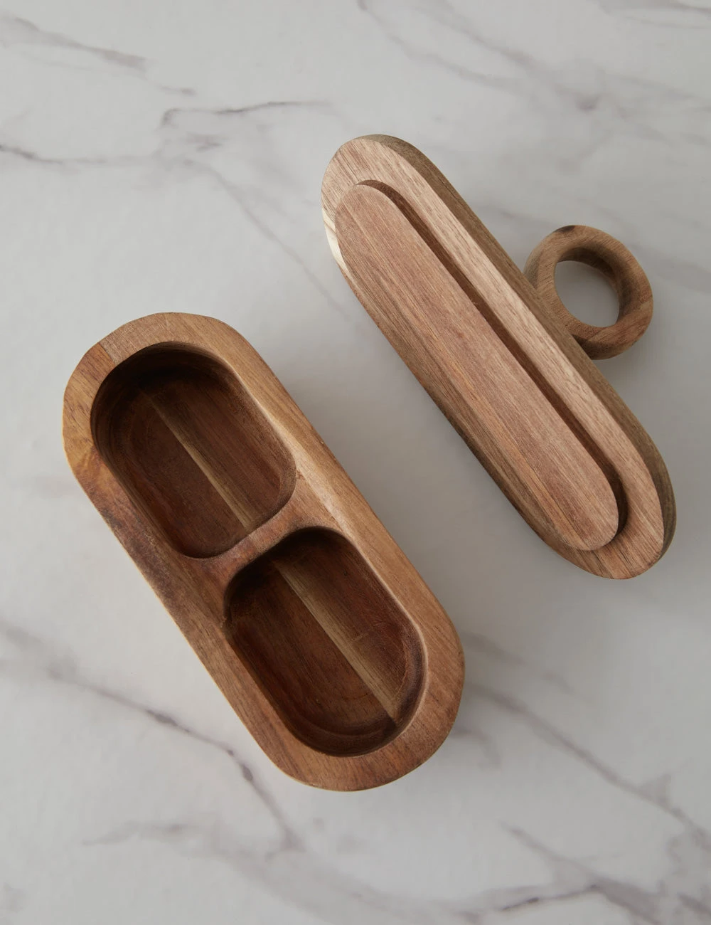 With two compartments, this small wood container offers stylish covered storage for everyday essentials. The soft, rounded lines and beautiful acacia grain will bring effortless warmth to any counter or tabletop. You can even style this versatile piece as a handy catchall for sorting odds and ends.