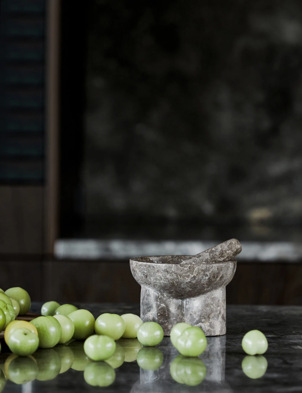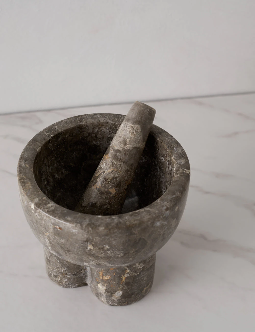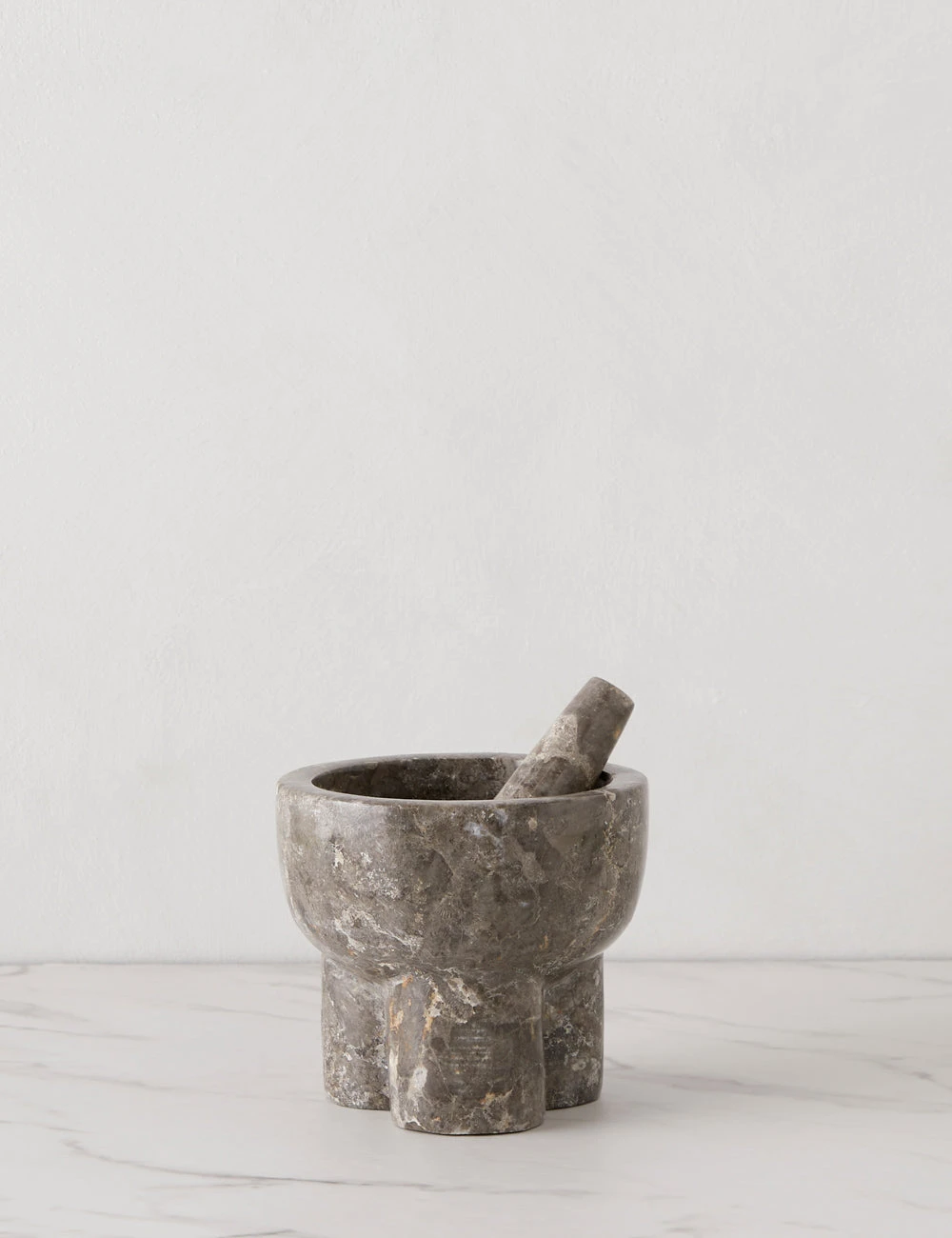 Grind and mix fresh spice blends with this elemental mortar and pestle set. Its basin sits on a chunky clover-shaped base, all made from solid marble to offer an earthy appeal with rich mineral tones.